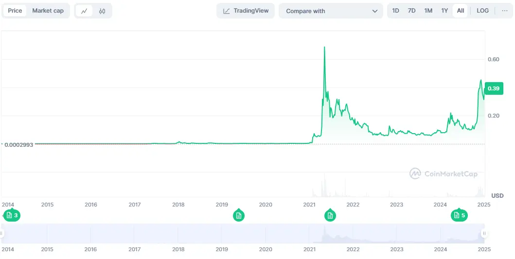 도지코인은 위에서 보는 바와같이 일론 머스크의 지지후에 급등한 코인입니다. 상장을 한지는 꽤 오래되었습니다. 그 후에 밈코인의 대표주자로 일론 머스크의 지지로 어마어마한 상승을 하였습니다. 하지만 급등후 주춤한 그래프가 보이실겁니다. 하지만 최근에 트럼프의 미국 대통령 당선으로 큰 힘을 받고 있습니다. 현재도 급등한 그래프를 보실수 있겠지만 이번 상승은 단순한 상승이 아니라는 점을 눈여겨 보셔야 합니다. 아직 고점을 돌파한 상황도 아니고 미국 트럼프 대통령에 의해 더 힘이 실리지 않을까 생각이 됩니다.